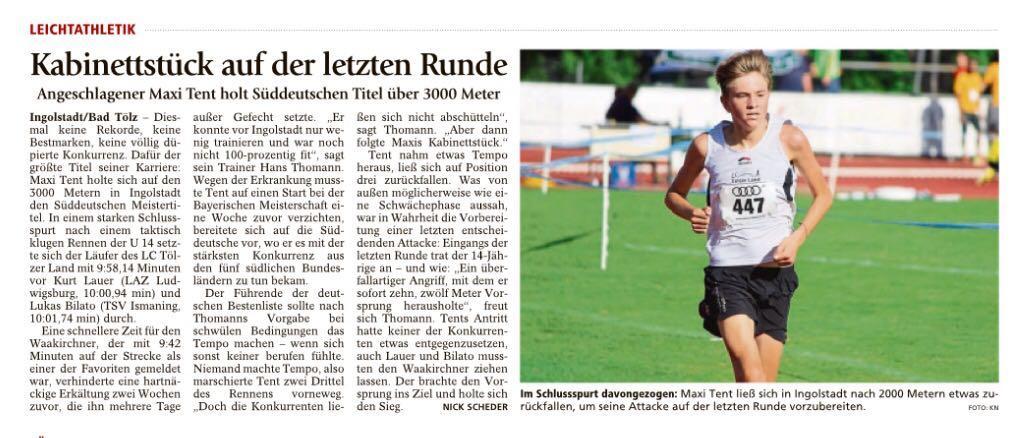 Als meine Zeit beim Zieleinlauf feststand habe ich mich narrisch gefreut“ strahlt Tom Scheifl im Ziel. Mit 34:55 läuft er in Mettenheim Saison-Bestzeit und diese war den Meistertitel in seiner Altersklasse wert. Doch auch die weiteren Isarwinkler Läuferinnen und Läufer konnten ihre gute Form der letzten Wettkämpfe unterstreichen. Bei den Männern M50 belegte Erwin Matheis Platz 3 mit der sehr guten Zeit von 38:08. Die Lenggrieser Uli Heim (39:17) und Helge Stöcker (41:17) liefen ebenfalls mit neuen persönlichen Bestzeiten auf Rang 5 und 6 in der AK M45 (alle LC Tölzer Land). (mehr …)
