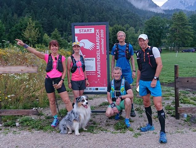Bild: Dani mit Merlin), Sandra, Markus, Martin und Wolfgang beim Start in Scharnitz